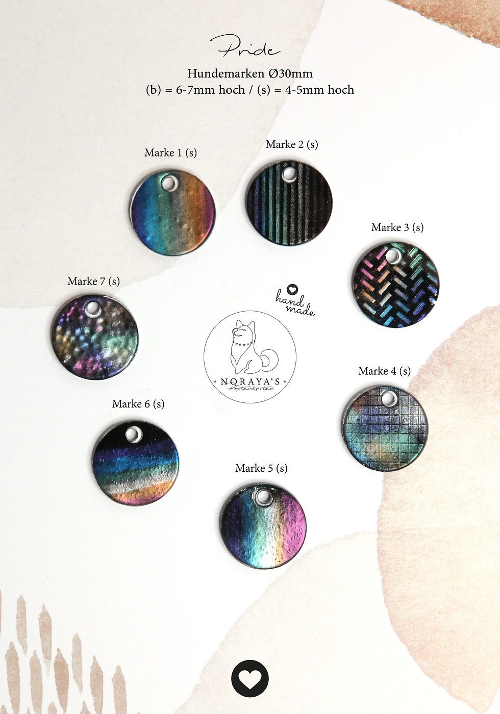 Basis Hundemarken sind handgemachte, individuell gestaltbare Rohlinge für deinen Hund, personalisierbar mit Namen und deiner Telefonnummer. Jeder Rohling ist ein Unikat, das mit einem Schlüsselring und einem kleinen Metallanhänger ergänzt wird, perfekt fürs Halsband deines Haustiers.